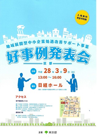 東京都産業労働局で実施されている「地域展開型中小企業処遇改善サポート事業」の発表会にて、従業員の定着促進などの処遇改善に取り組んだ企業の好事例として発表をさせていただきました。 発表テーマ:~100年企業を目指して 引き継ぐ理念、引き継がれる風土~