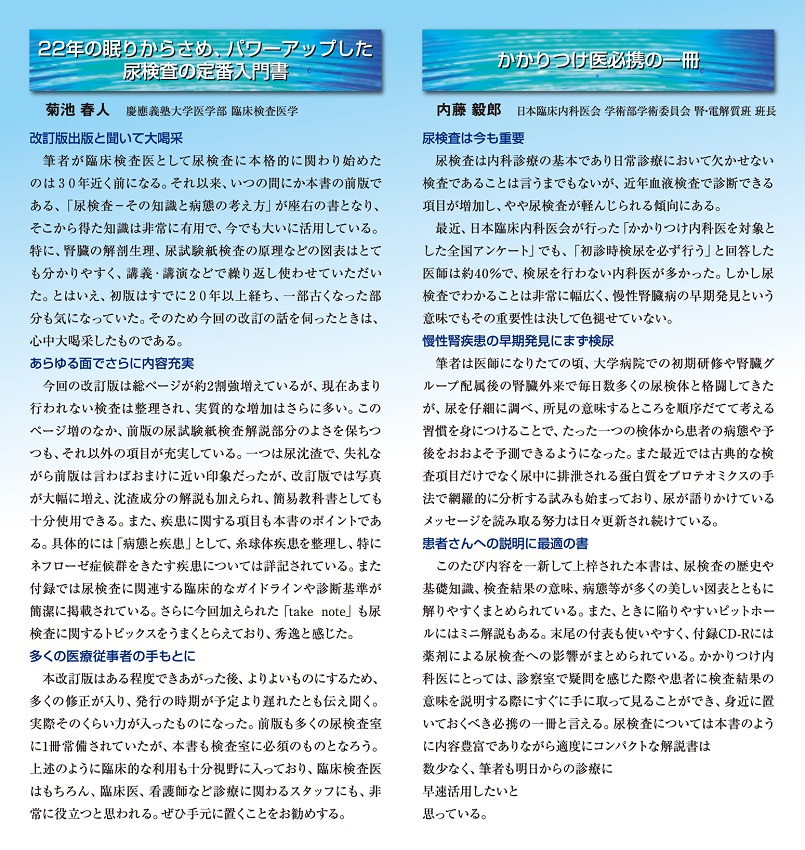 2014年9月、尿検査に関する基礎知識を満載した「最新尿検査 ―その知識と病態の考え方」を 刊行しました。初版は1992年で、今から20年以上前になります。当時も多くの読者から好評でしたが、 今回内容を一新し、新しい知見が多数掲載されています。尿検査に関する基本情報や、本書の特徴などをQ&Aで解説します。